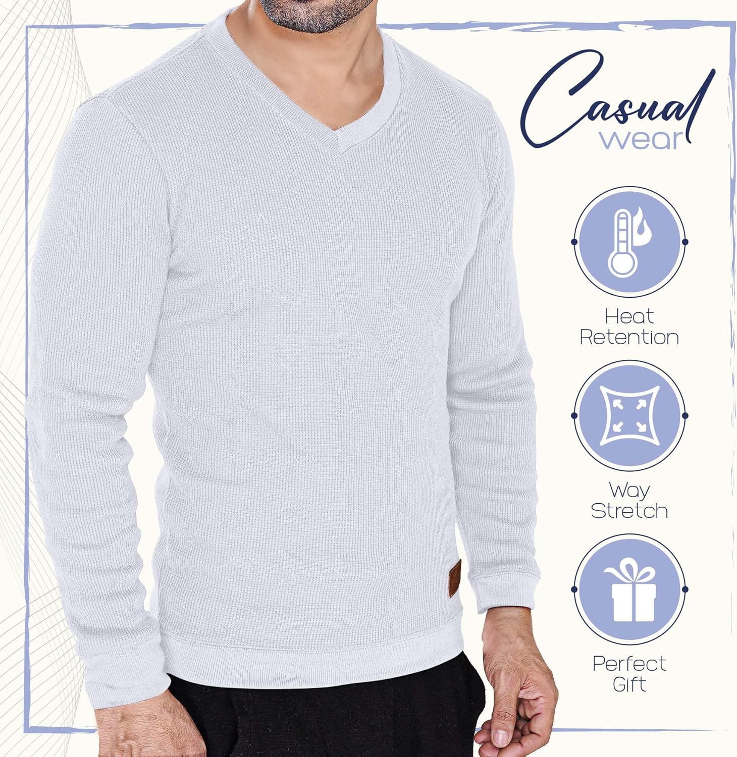 Introducing the Men’s Waffle Knit V-Neck Shirt – your go-to companion for embracing warmth and style, all in one cozy package. Crafted with care from a blend of 60% cotton and 40% polyester, this waffle knit fabric is like a warm hug on chilly days. It’s more than just a waffle shirt, it can be used as knit sweater for men or waffle sweatshirt for men. this soft heavyweight sweatshirt can act as your shield against the cold, and your partner in comfort. If you’re the kind who values both warmth and durability, look no further. Getting dressed has never been easier. With its v-neck pull-on closure and relaxed fit, this heavyweight thermal top exudes effortless style. The soft cotton fabric not only feels heavenly against your skin but also boasts a timeless charm that never goes out of fashion. Dress up or down – this shirt effortlessly adapts to your every mood. Bid farewell to those pesky, itchy tags that seem to always find a way to annoy you. Our waffle shirt comes with a tag-free neck label for an extra dose of comfort. Now you can revel in the fabric’s softness without the irritation, making it an ideal choice for all-day wear. And thanks to the addition of Spandex rib wrist cuffs, you can enjoy a snug fit that keeps the cold air at bay. But that’s not all – we believe in self-expression. That’s why we offer a vibrant spectrum of eight beautiful colors. From classic Raven Black waffle shirts for men to pristine Bright white long sleeve shirt men or perhaps the eye-catching Cornflower Blue waffle knit sweater and Tibetan Red sonoma long sleeve thermal – the choice is yours. Elevate your wardrobe with these versatile and stylish color options, and let your personal style shine through. So, whether you’re seeking warmth, comfort, durability, or a touch of personal flair, the Men’s long Sleeve V-Neck Shirt has got you covered. Embrace the cozy embrace of this shirt and make a statement, all while feeling like your true, comfortable self. Package Includes: 1 x Waffle Knit V-Neck Shirt